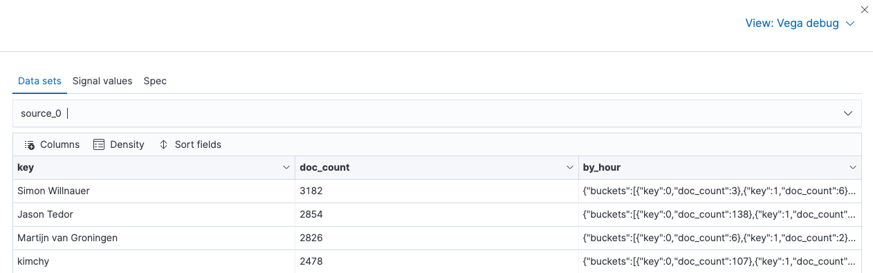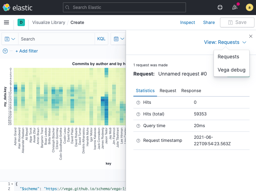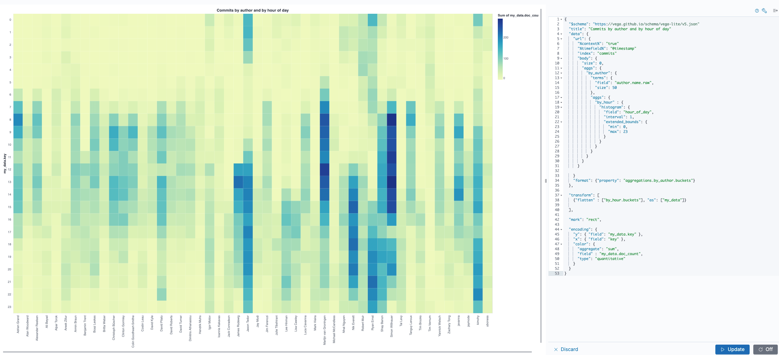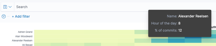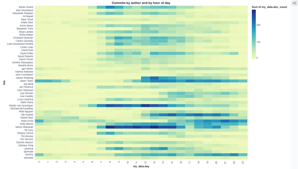 TLDR; This blog post will give a small introduction into Vega visualizations within Kibana in the Elastic Stack. We’ll go step by step to end up with this visualization to see the most productive commit times per author, based on the git repository meta data.