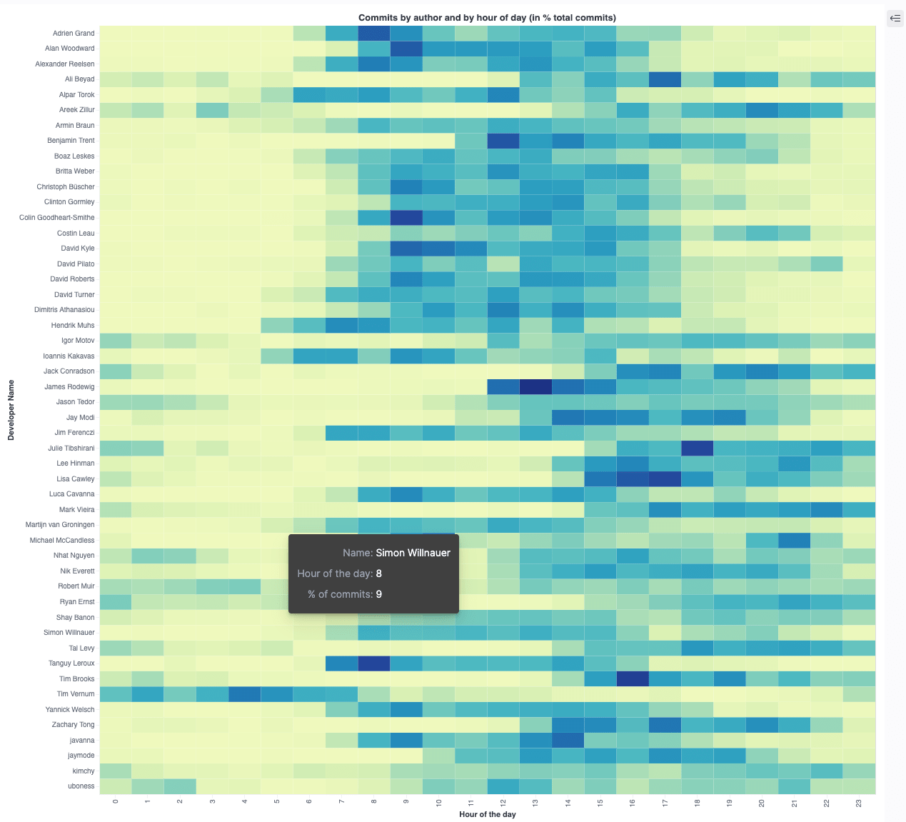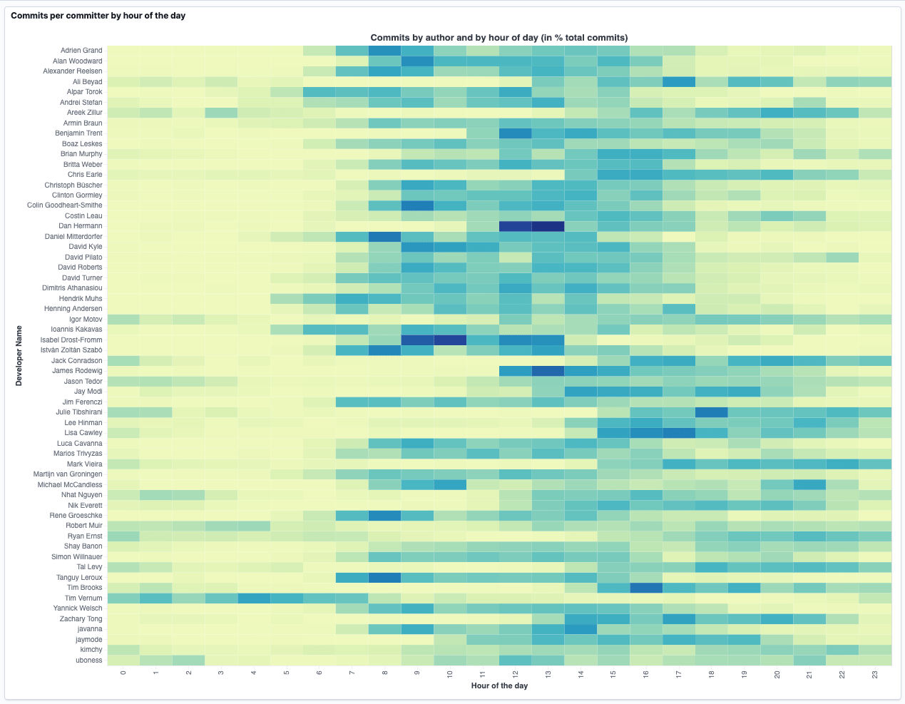 As you can see now each committer has a nice row of commits, which makes it very easy to spot when a committer is most active. Take a look at the third row from the top, which is me and clearly I used to commit most of my code from 8am till 5pm - which makes perfect, as I usually start at 9am my time until 6pm, as I am based in Germany.