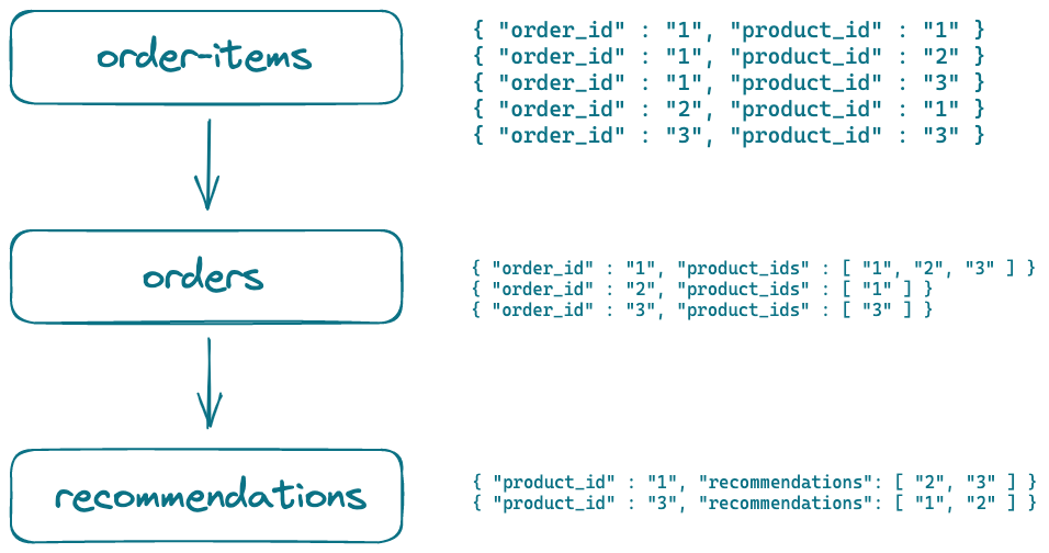 So, what does this diagram mean? First, we transform from an ungrouped list of order-items to a list of orders, which contain the products that have been part of that order.