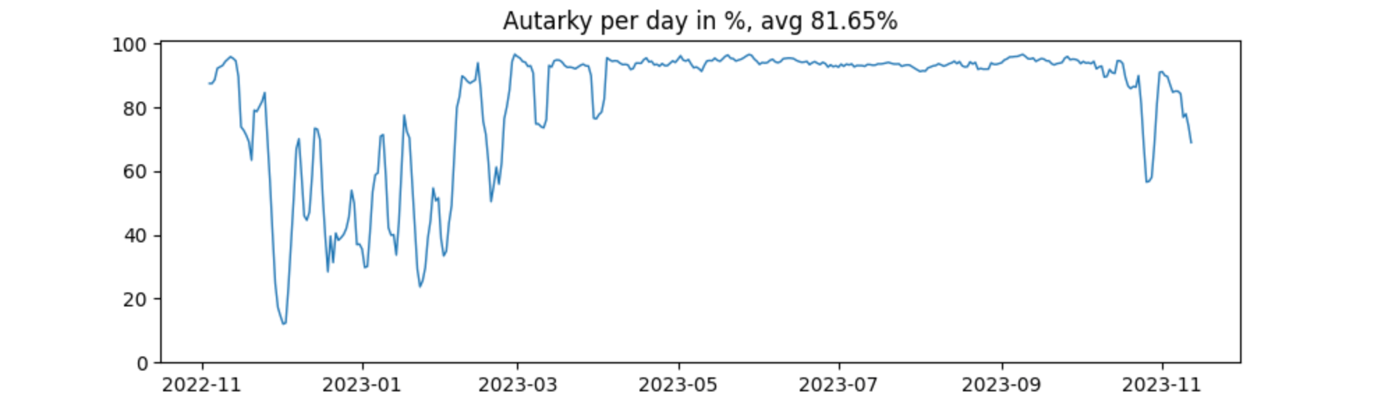 The six months during and around summer are pretty much fed by solar. From November till March there is much more variance, as now this is highly dependent on the sun filling up the battery. In December 2022 there were a couple of really cloudy days in a row.