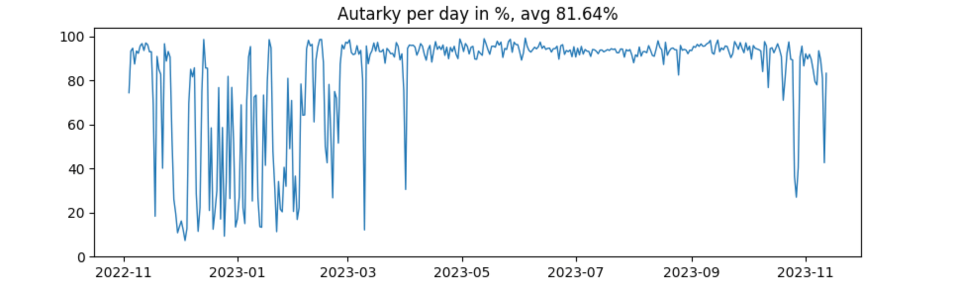 ax.set_title("Autarky per day in %, avg {:.2f}%".format(sum))