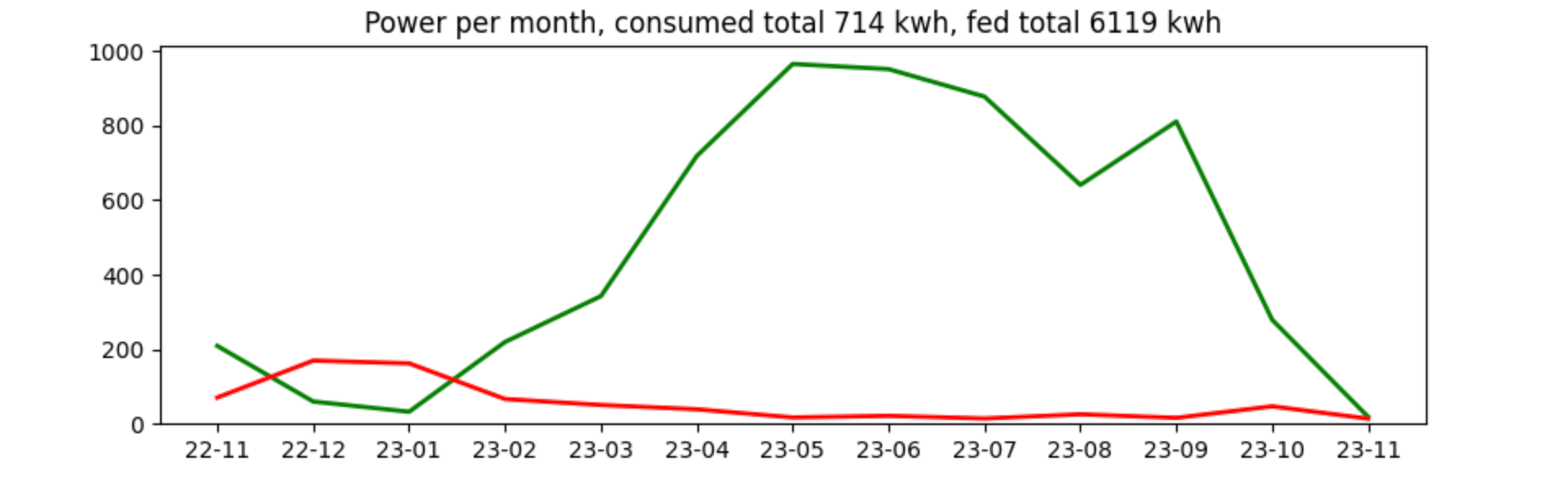 Power consumption in general is not super high in our household, even the winter consumption felt ok to me. We can overlay this with the feed-in, and see that there is no surprise: