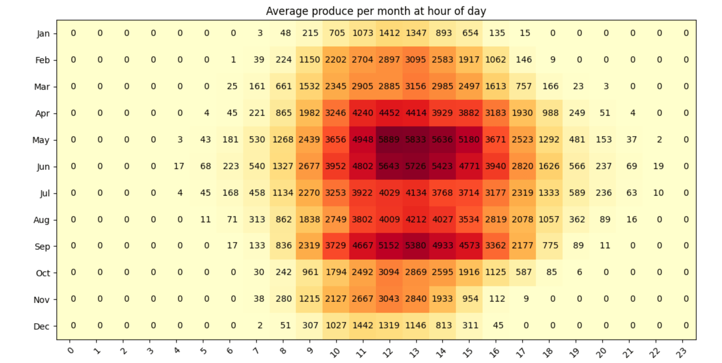 The output of this is a table with 12 rows and 24 columns. Now the last step to create a heat map out of this:
