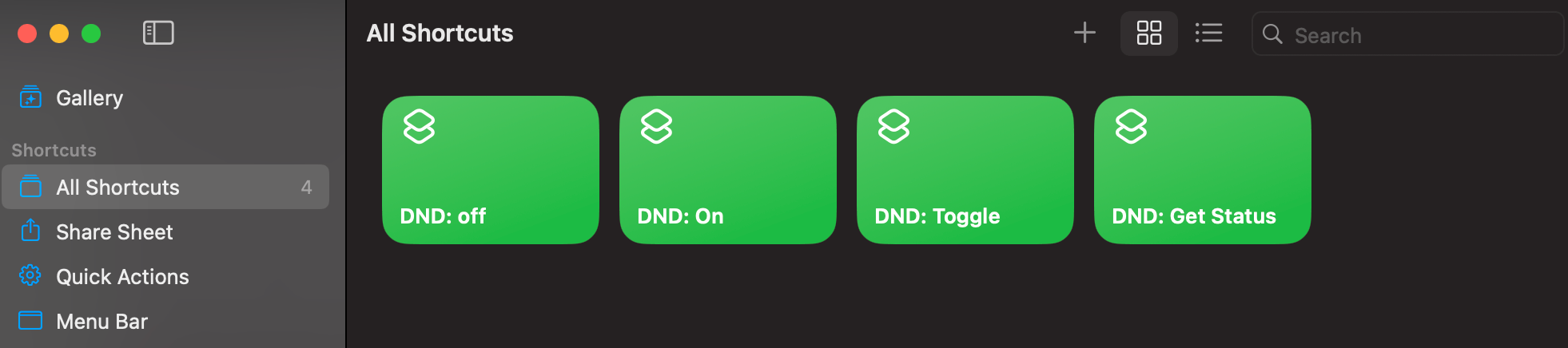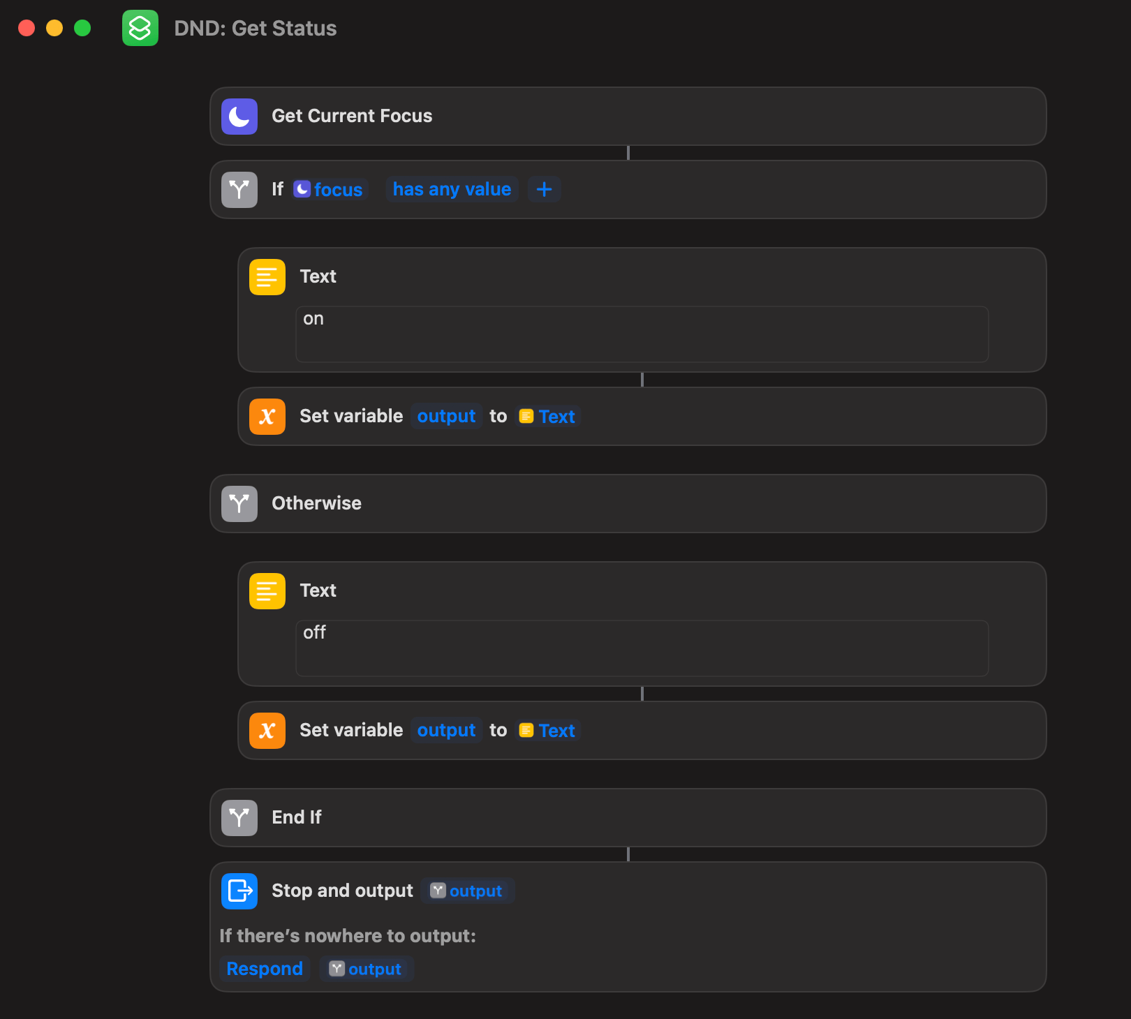 ❯ /usr/bin/shortcuts run 'DND: Get Status' \