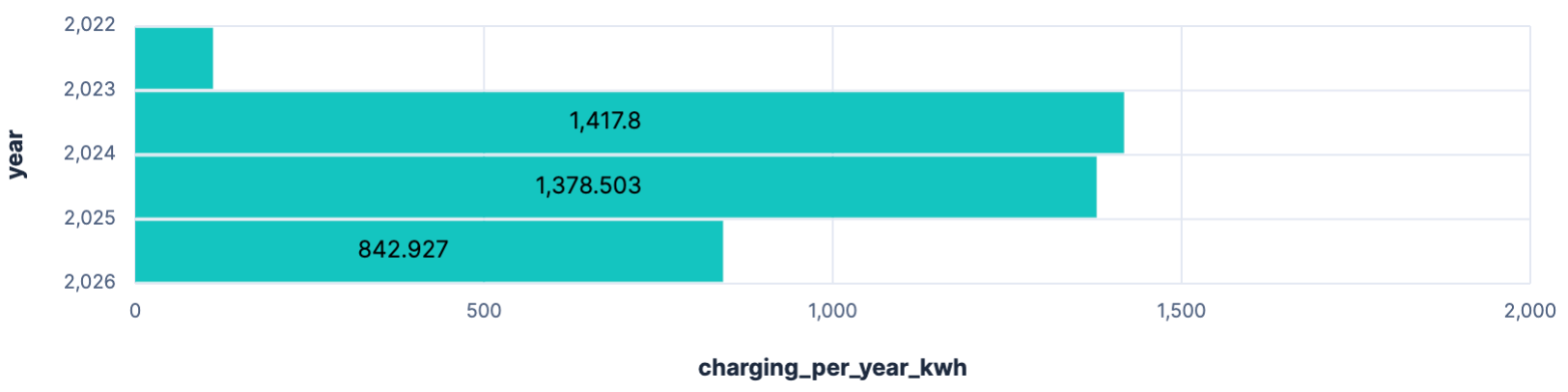 FROM solar-daily | STATS charging_per_year_kwh = SUM(eChargingPile) BY year = BUCKET(date, 1 year)